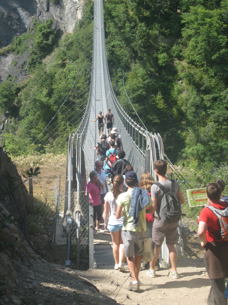Après une pause sieste, nous reprîmes la route et furent confrontés à nos premiers obstacles : deux superbes passerelles himalayenne suspendue au dessus des gorges, que nous franchîmes sans difficultés, profitant au passage (pour les plus courageux) d’une vue à couper le souffle.