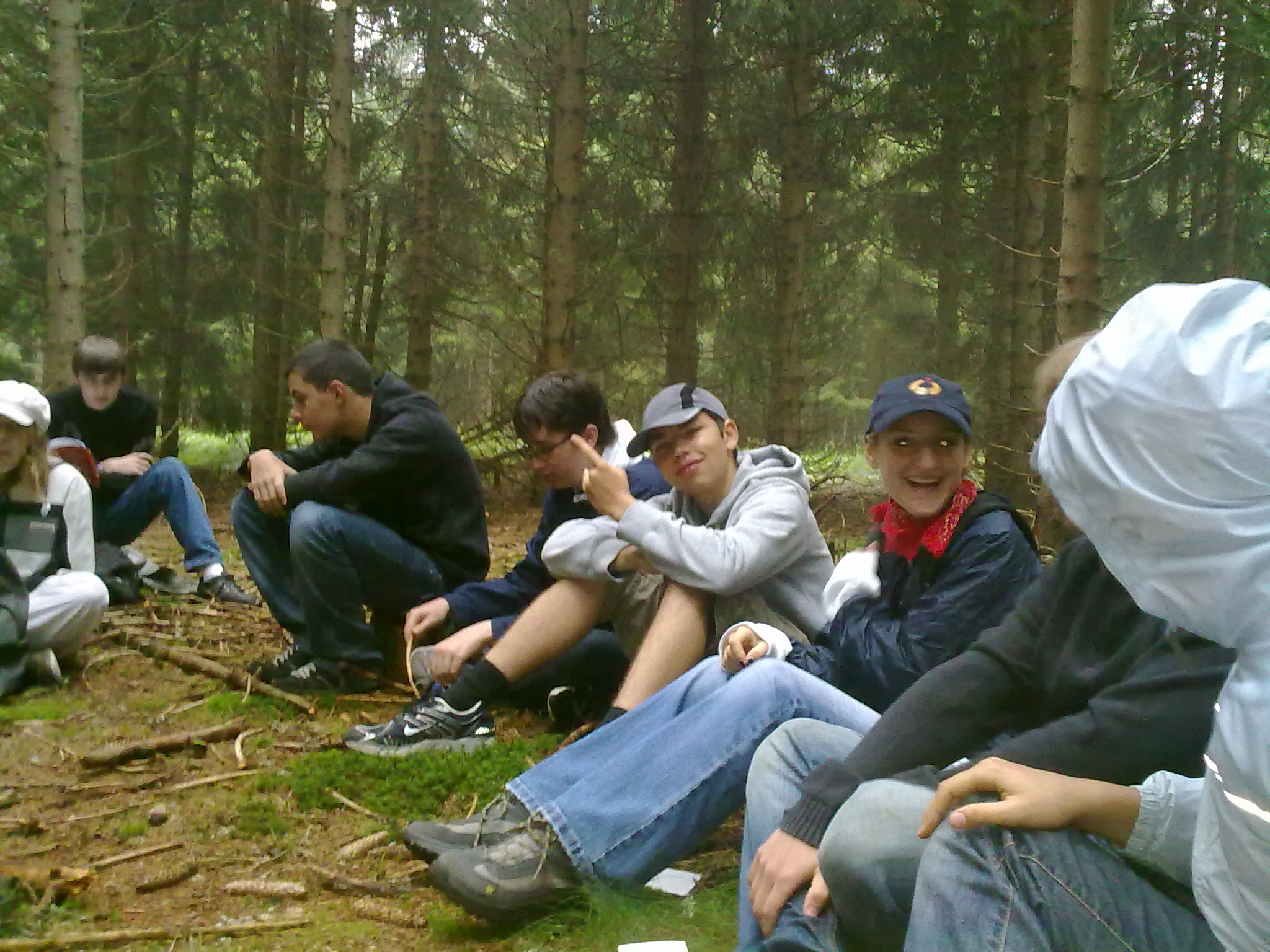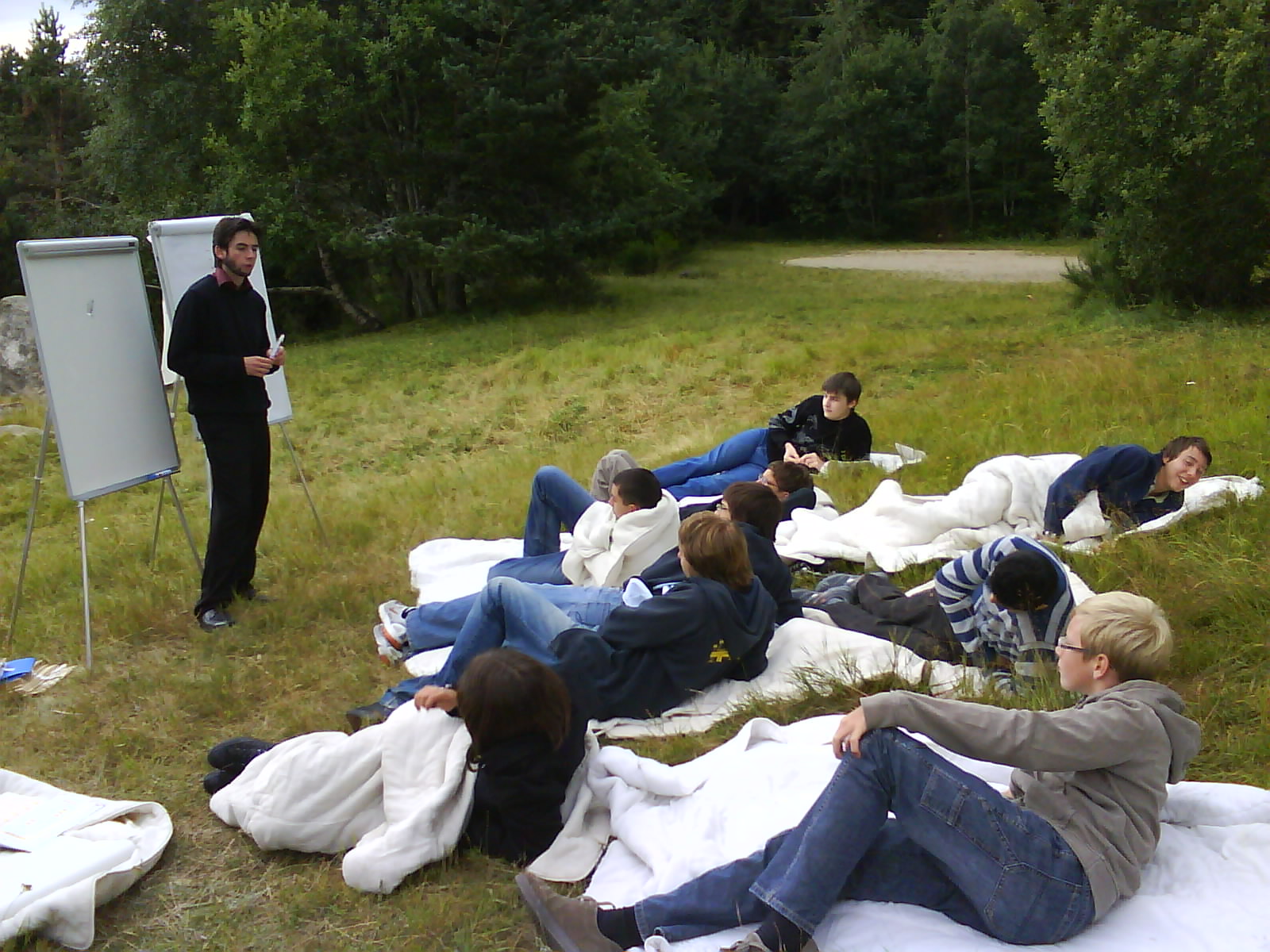 Dimanche, les gens paressent mais pas à Objectif-Sciences ! Le réveil est comme d’habitude entre 7h30 et 8h30 pour nos aventuriers qui se préparent à partir en randonnée. Le départ du centre s’effectue vers 10h20. La route est longue et l’ambiance est bonne, jusqu’à 12h30... Et là, c’est le drame. Le temps est capricieux et la pluie tombe, encore et encore. Décidant de braver les éléments pour un temps, le groupe des randonneurs va se mettre à l’abri dans une forêt proche. Afin de passer le temps, des jeux s’organisent. Au programme : Loup-Garou et Sardine. Cependant, après quelques parties, la pluie redouble et les animateurs sonnent la retraite. Nos courageux marcheurs repartent donc sous la pluie battante, dans les flaques et la boue. Peu avant d’arriver au centre les nuages s’écartent. La soirée camping est tout de même annulée (EPIC FAIL !). Une soirée de rechange est organisée tant bien que mal : chippolatas et mergez pour tout le monde comme au camping, obligation de chanter pour obtenir du rab comme autour du feu de bois, et soirée béret quelque peu modifiée pour rendre ce jeu classique plus épique et passionnant. La soirée est un succès et tout le monde retourne se coucher pour se préparer à une deuxième semaine de camp.